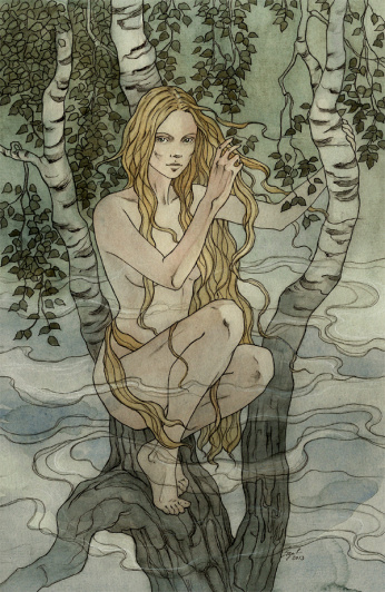 Quando retratada, ela aparece como uma mulher com longos cabelos loiros ou brancos.